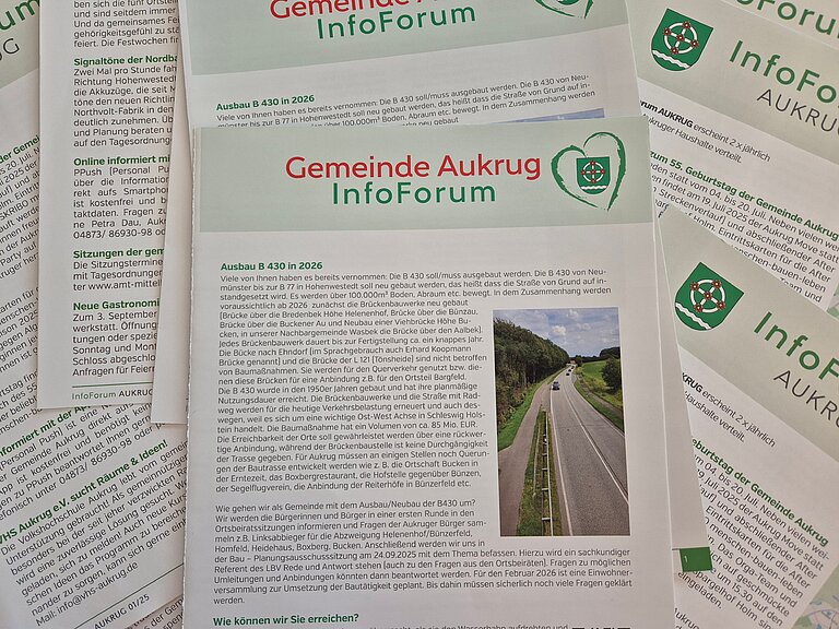 Die fünfte Ausgabe vom InfoForum AUKRUG wird Ende Februar 2026 an alle Aukruger Haushalte verteilt und zusätzlich online auf der Homepage der Gemeinde Aukrug veröffentlicht. Haben Sie bzw. Ihr Verein/Verband Veranstaltungstermine im Zeitraum von März bis August 2026, die veröffentlicht werden sollen? Schicken Sie mir gerne einen kurzen Text zu Ihrem Termin mit Datum, Uhrzeit und Ort, Redaktionsschluss für die Ausgabe 1/2026 ist Donnerstag, der 12. Februar 2026