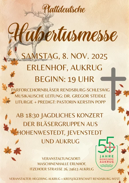 Der Hegering Aukrug richtet die Hubertusmesse für die Kreisjägerschaft RD-West aus. Pastorin Kirsten Popp wird den plattdeutschen Gottesdienst halten und die Parforcehornbläsergruppe die Hubertusmesse blasen. Ab 18.30 Uhr findet ein jagdliches Konzert der Bläsergruppen aus Hohenwestedt, Jevenstedt und Aukrug statt.